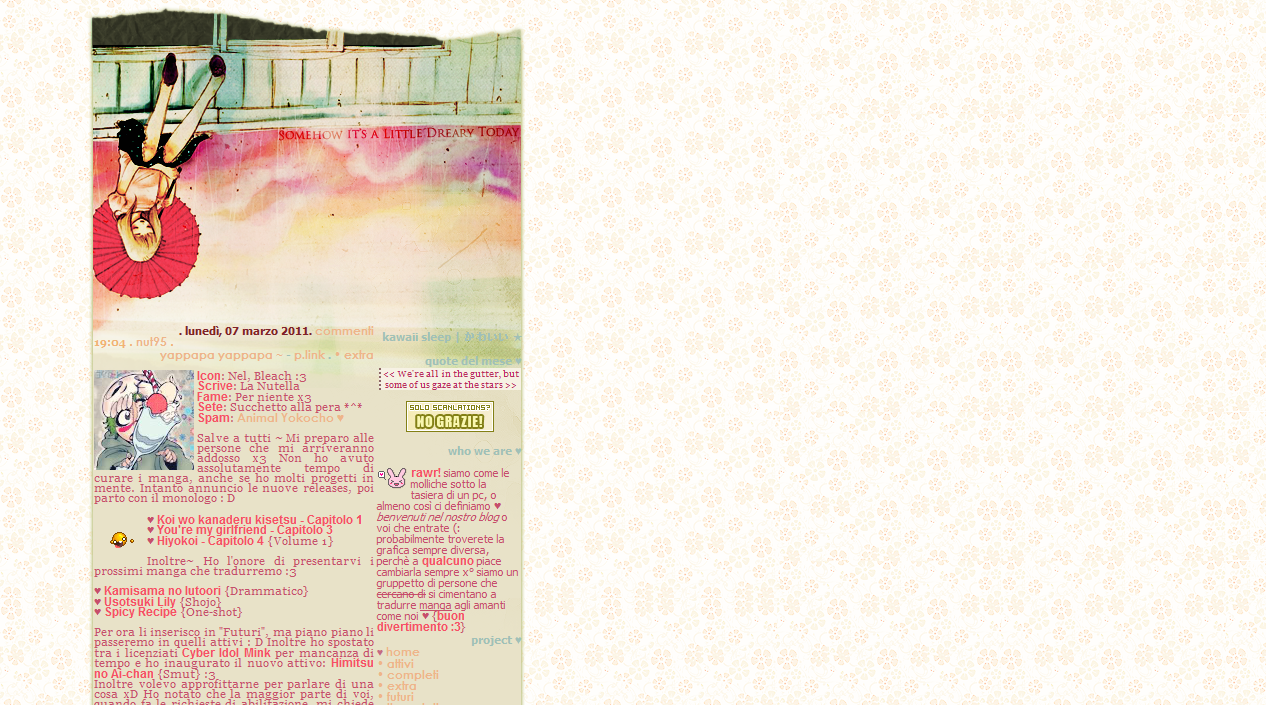 Man~ga! E non intendo il canale televisivo (lol?). Lo scrivo perchè tanti anni fa avevo un gruppo di traduzione manga (il Kawaii Sleep -kawaiisleep.forumfree.net-, buon'anima), e mi dispiacerebbe non condividere più da nessuna parte quella che era la mia passione d'infanzia: editare manga. Ecco qui un po' di storia del forum (e mia), e poi vi introduco i manga inediti che avevamo editato e tradotto per i lettori di shojou come noi: 1 | 2 | 3 | 4 | 5 | 6 | 7 Per chi volesse accedere alla dispensa (per intero) di tutti i capitoli di tutti i manga che avevamo, segua questo link e si faccia una scorpacciata! Buona lettura! PS. Attualmente sono editrice nel marimo cafè!